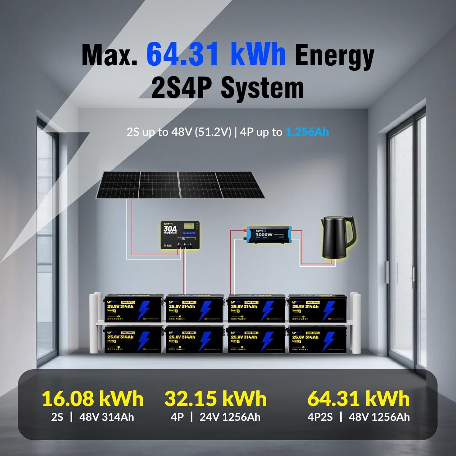 - ăFlexible Expansionă The WattCycle 24V 314Ah lithium battery delivers 8038Wh of energy and supports up to 4p2s, providing 1256Ah at 48V â an excellent choice for RVs, offering long-lasting power for your journeys. It also supports up to 2 in series, making it ideal for 48V solar power systems