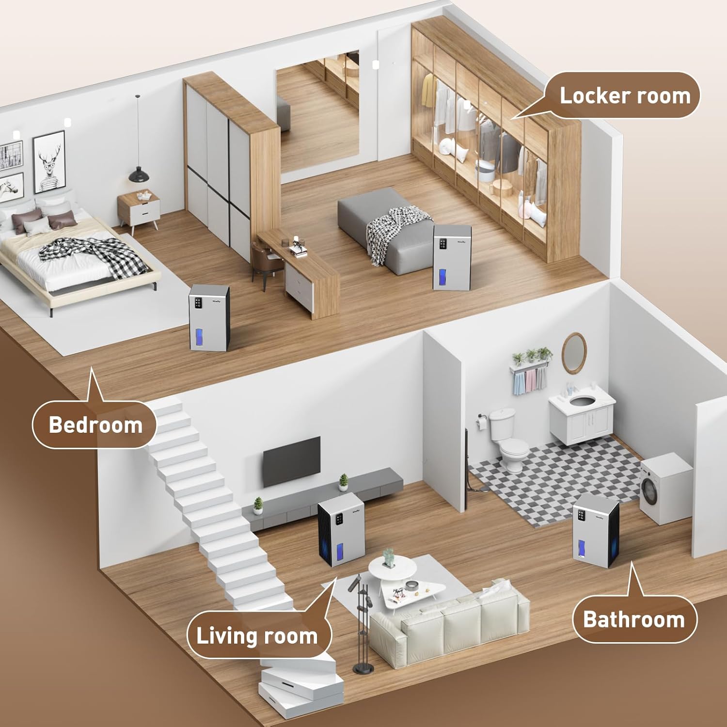 - COMPACT DEHUMIDIFIERS: Portable and perfectly sized for bathrooms and similar spaces. Dimensions: 8.3(L) x 5.5(W) x 14(H) inches. This dehumidifier covers up to 1000 sq.ft., making it ideal for bedrooms, closets, bathrooms, and basements. Its compact design is also well-suited for garages, kitchens, and other areas.