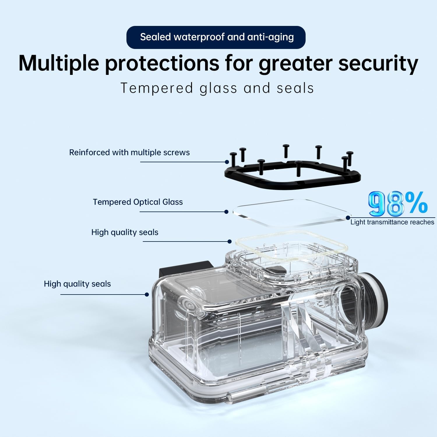 - High Light Transmittance: Waterproof case toughened glass in front of the camera, you can make your camera better light transmittance (light transmission rate of 98%). Shoot more real, more beautiful pictures.
