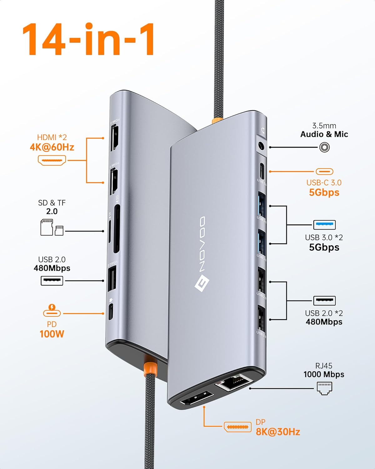 - NOVOO USB C Docking Station Dual Monitor, Laptop Docking Station, 14 in 1 Thunderbolt 3 to 2 HDMI 4K@60+8K DP 100W PD RJ45 SD/TF Audio, Multiport Adapter for Dell/HP/Lenovo