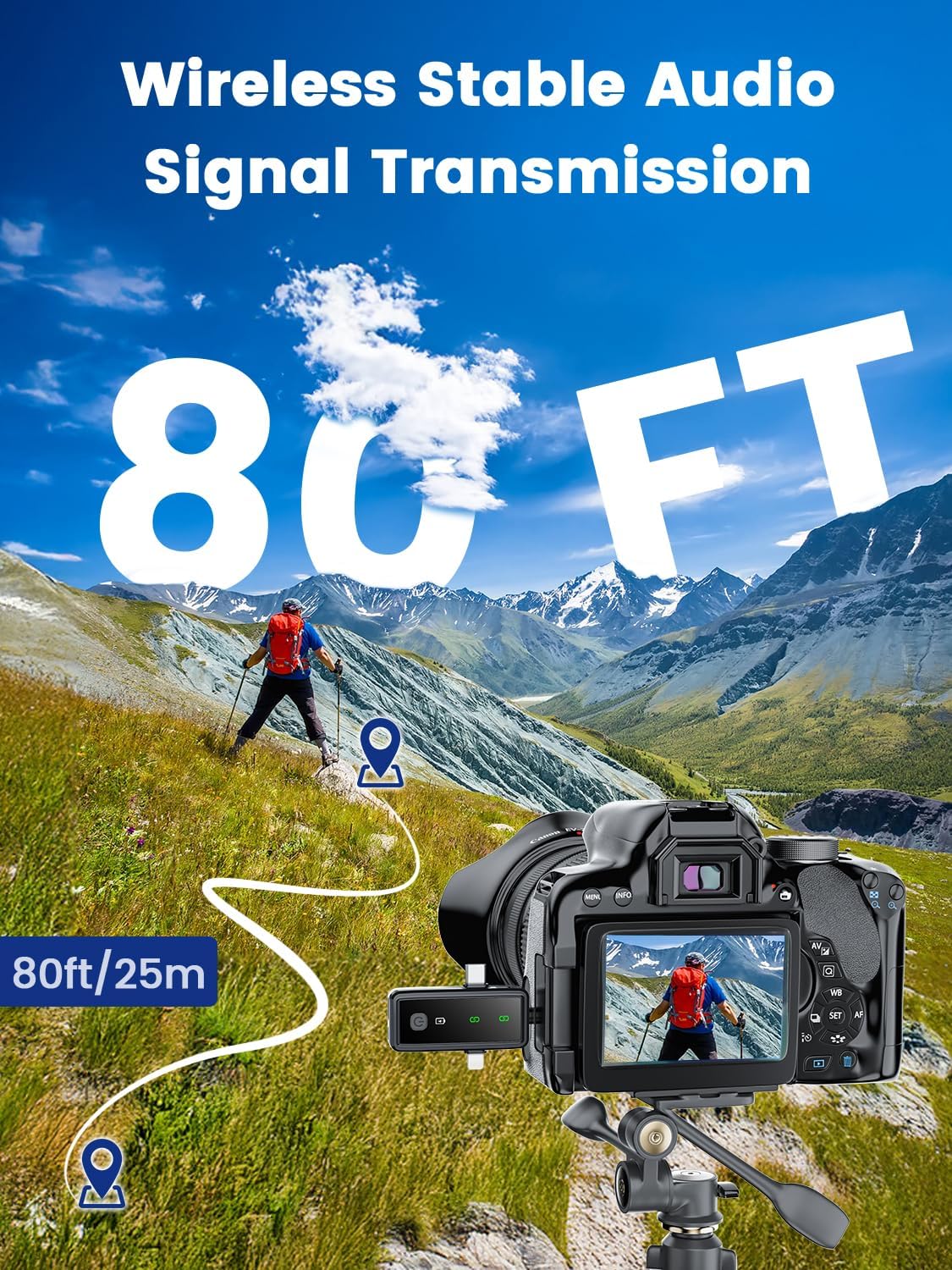 - ăStudio-Quality Sound, Zero Lagă Capture crisp audio up to 80ft away with our mini lav micâs 0.05s ultra-low latency. Ideal for filming wide-angle videos, presentations, or fast-paced action scenes. Includes 2 windproof foam covers and a fuzzy wind muff to block outdoor noise