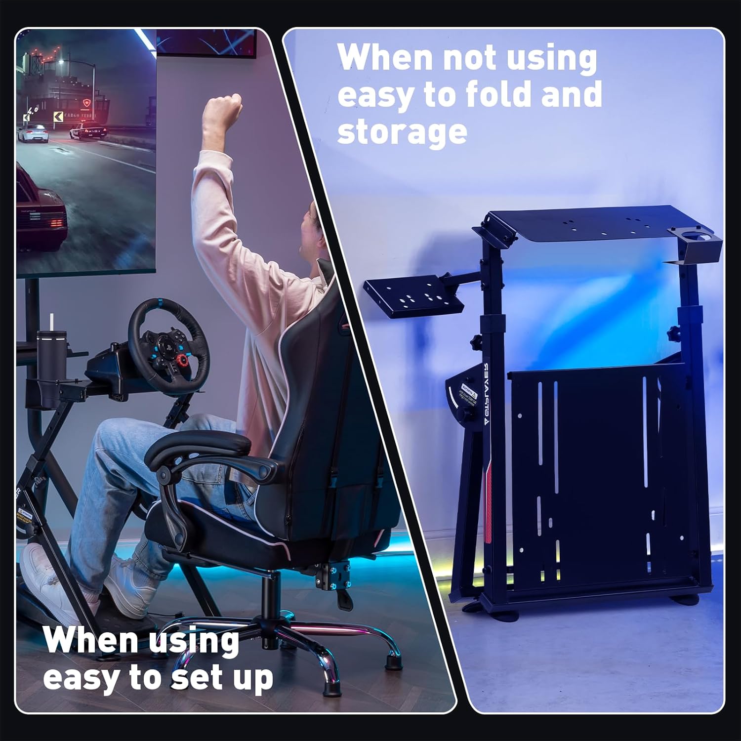 - 4.【Folded for storage】: After enjoying the game, you can easily fold this racing wheel stand and store it under your couch/bed or in the corner, making it a perfect choice for players with limited storage space. The compact design allows you to carry it anywhere to keep your gaming enthusiasm with you.
