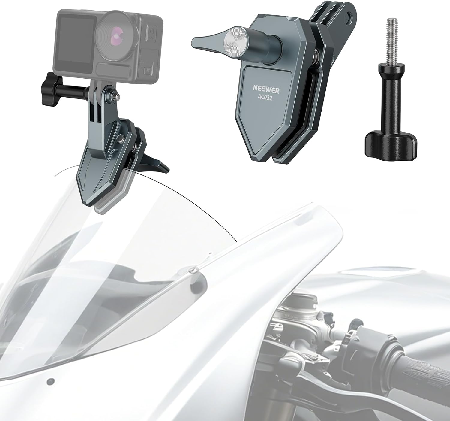 NEEWER Motorcycle Windshield Action Camera Clamp Mount, Aluminum Alloy Clip with 3 Prong Adapter & 1/4" Screw Hole Compatible with GoPro Hero 13 12 DJI Adapters for POV Video Recording, AC032