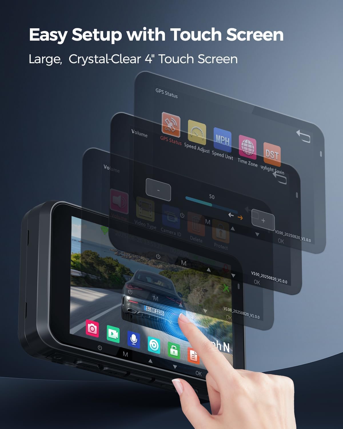 - 【4" Touch Screen】Effortlessly manage your dash cam with the responsive 4-inch HD touch screen. This intuitive interface allows you to instantly review footage, lock emergency videos, enable Wi-Fi, or snap photos directly on the device—all without needing your phone. The high-resolution display ensures clear on-the-spot playback and seamless menu navigation, putting full control and instant access right at your fingertips
